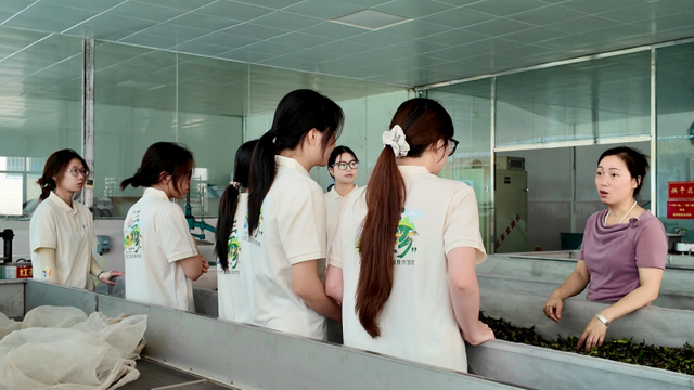 随后,调研组成员方培蔓、沈敏仪等来到必背镇瑶山茶叶加工基地,与市级瑶山茶制作技艺传承人盘伟珍深入交流。团队详细掌握了茶叶种植、采摘(遵循“一芽一叶”标准)、加工(杀青、烘干温控)等技术要点,探讨了“基地+农户”模式在带动增收、保障品质方面的优势,并就品牌建设、市场拓展的规划与挑战进行了交流,为产业高质量发展凝聚共识,助力构建“产业兴则乡村兴”的良性循环。